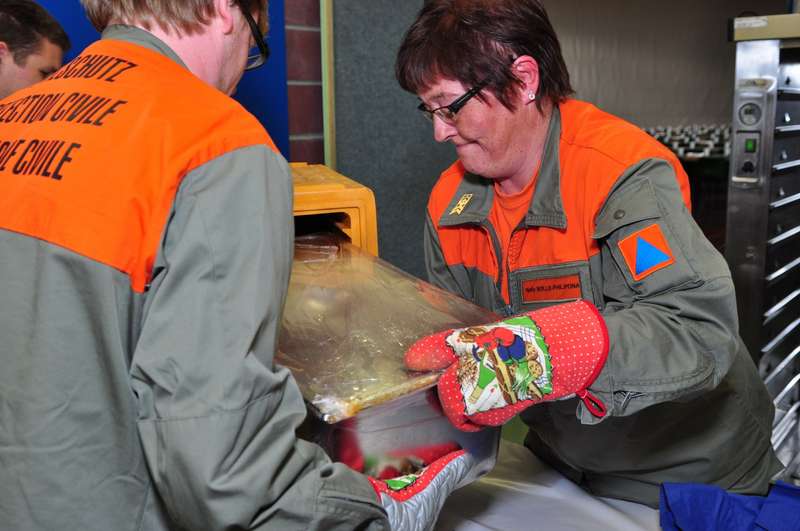 S’ajoute Ă cela la noble tâche de restaurer les troupes non-militaires. Depuis mardi, par tournus de deux Ă©quipes de 20 personnes, de 6 heures Ă minuit, ils sont une quarantaine de collaborateurs de l’organisme rĂ©gional de la pRotection civile (PCi) de Lausanne-nord Ă occuper la salle polyvalente du Pierrier, Ă Clarens, amĂ©nagĂ©e en vaste rĂ©fectoire (480 places) et cuisine. Ni carotte ni patate Ă peler pour eux. Les repas sont apprĂŞtĂ©s par un traiteur. LivrĂ©s Ă Clarens, ils sont servis par les collaborateurs PCi. Au terme de six jours d’engagement, 1’000 petitsdĂ©jeuners, 3’000 dĂ®ners et 2’800 repas du soir et 1’300 lunchs auront Ă©tĂ© remis. Au plus fort de l’engagement, jusqu’à 620 couverts auront Ă©tĂ© dressĂ©s. Au menu de mardi midi, un excellent veau marengo.
