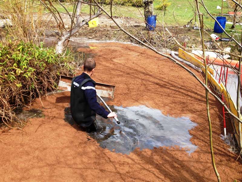 Ils nettoient les cours d’eau en grattant le sol avec pelles, pioches et râteaux, Ă©tendent de l’absorbant et rĂ©cupèrent la matière polluante dans le biotope. Les rives de ce dernier sont aussi nettoyĂ©es avec des lances Ă incendie grâce Ă deux motopompes type 1. Les roseaux sont coupĂ©s et les abords du biotope sont pulvĂ©risĂ©s d’un produit dĂ©graissant. Une petite barque est aussi employĂ©e pour nettoyer la surface de l’Ă©tang.