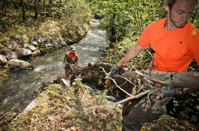 1. Sur le site de la Châtaigneraie, il s’agit de poursuivre le travail, initié par les bûcherons de la région, de déblaiement des morceaux de bois tombé dans le Greny. En effet, il est important d’évacuer un maximum de déchets pour éviter des embâcles qui empêcheraient le passage de l’eau et pourraient provoquer des inondations en cas de fortes précipitations. L’utilisation de nombreux outils comme une tronçonneuse ou un tire fort sont nécessaires à l’accomplissement du travail afin de couper les troncs, les déplacer puis les évacuer.